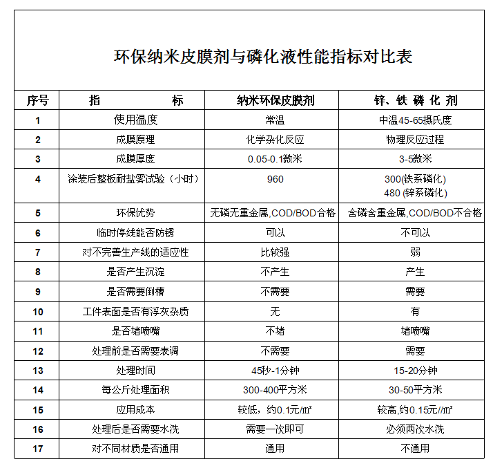環(huán)保納米皮膜劑與磷化劑的性能指標(biāo)比較如下: