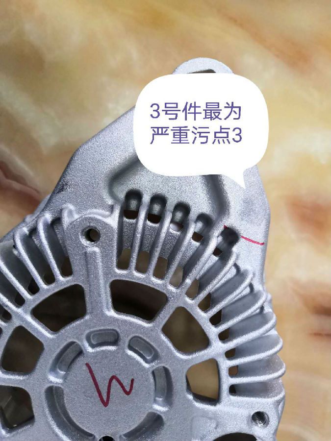 本案例供有類似情況的朋友參考,某家生產(chǎn)汽車配件的公司,材料為壓鑄鋁合金,其生產(chǎn)工序是工件噴砂拋光,然后做機加工,機加工完成后工件的出現(xiàn)如圖片上的狀況: